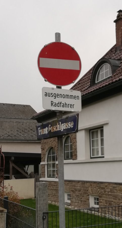 Sehr oft handelt es sich dabei um Einbahnen, die (noch) nicht für Radfahrende in Gegenrichtung freigegeben sind. Da fahre ich wenn die Straße mir dafür geeignet scheint gerne gegen die Einbahn, um so zu zeigen, was Sache ist. So eine Straße gibt es in Purkersdorf. Seit Jahren schon fahre ich da gegen die Einbahn, da es einfach keinen Sinn macht, hier das Fahrverbot zu beachten. Diese Straße ist eine Nebenstraße, wirklich kaum befahren und breit genug, um den Radfahrenden das fahren gegen die Einbahn zu gestatten.