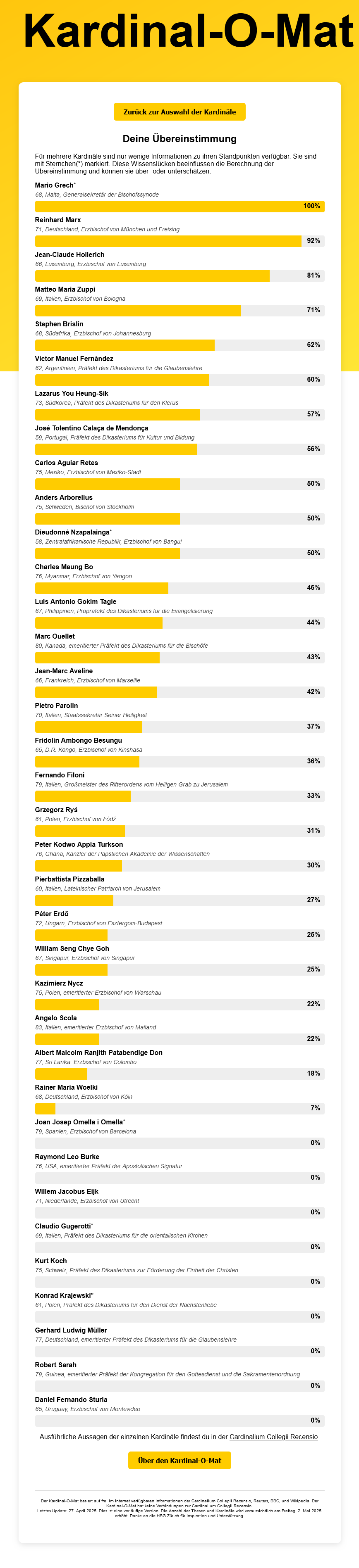 Der von mir dank einiger seiner Aussagen und vor allem auch seines Lebenswandels wirklich geschätzte Papst Franziskus ist nun so lange tot, dass die Spekulationen rund um seine Nachfolge am Höhepunkt scheinen. Überall hört man Vermutungen, zusammen mit Namen, die noch niemand kennt. Ein Web-Entwickler aus der Schweiz hat sich die Mühe gemacht, einen Papst-o-Mat zu programmieren, und zwar, laut eigenen Angaben, zu den Informationen einer öffentlichen Webseite, auf der stehen soll, wie sich welcher Kardinal zu den Themen unserer katholischen Gesellschaft verhält. Es wurden also sozusagen die Gesinnungen der Kardinäle in Fragen gemeißelt nach deren Beantwortung sich der