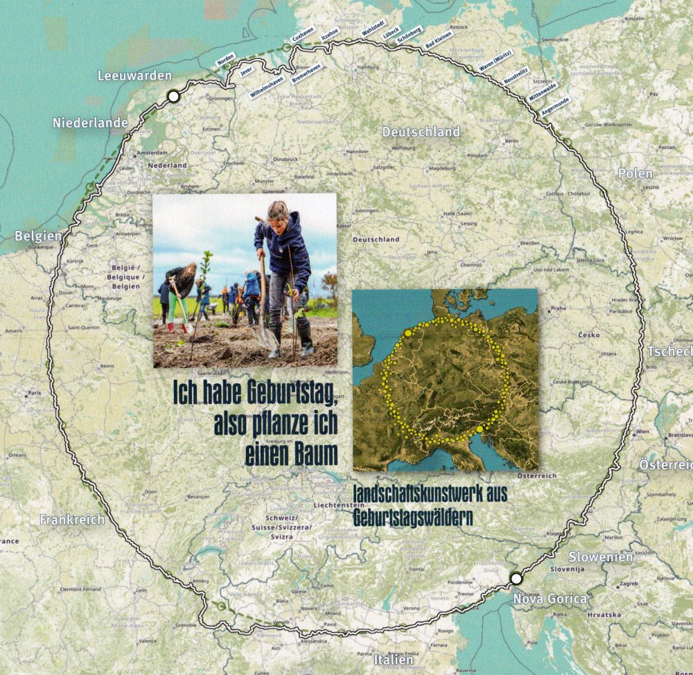 Bei der heutigen Tour fährt auf einmal ein Baum vor mir auf der Straße. Etwa vier bis fünf Meter hoch, viele Äste und noch mehr Blätter, ein Baum eben. Auf einem Fahrrad. Mit E-Unterstützung. Ich bin so baff, dass ich glatt darauf vergesse, ihn zu fotografieren. Aber stehen bleiben kann ich noch. Der ebenfalls auf einem Fahrrad den Baum begleitende Mann bleibt stehen und erklärt mir, was sie da tun. Es ist eine Fahrt über 5000 km von Holland in einem Kreis über ganz Europa nach Holland zurück. Gestartet sind sie im April, im September wollen sie wieder zurück sein.