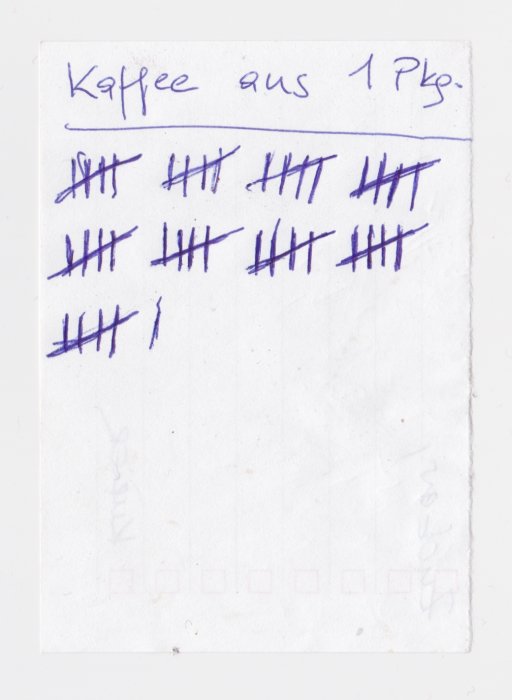 Die Kaffeemaschine ist gewartet und repariert, da wollte ich nur noch wissen, wie viel mir ein Kaffee eigentlich kostet. Oder genauer gesagt: Wie viel ich mir gegenüber einem Kaffee von Nespresso erspare. Also habe ich ab dem Beginn einer neuen Packung meines Kaffees eine Stricherlliste geführt.