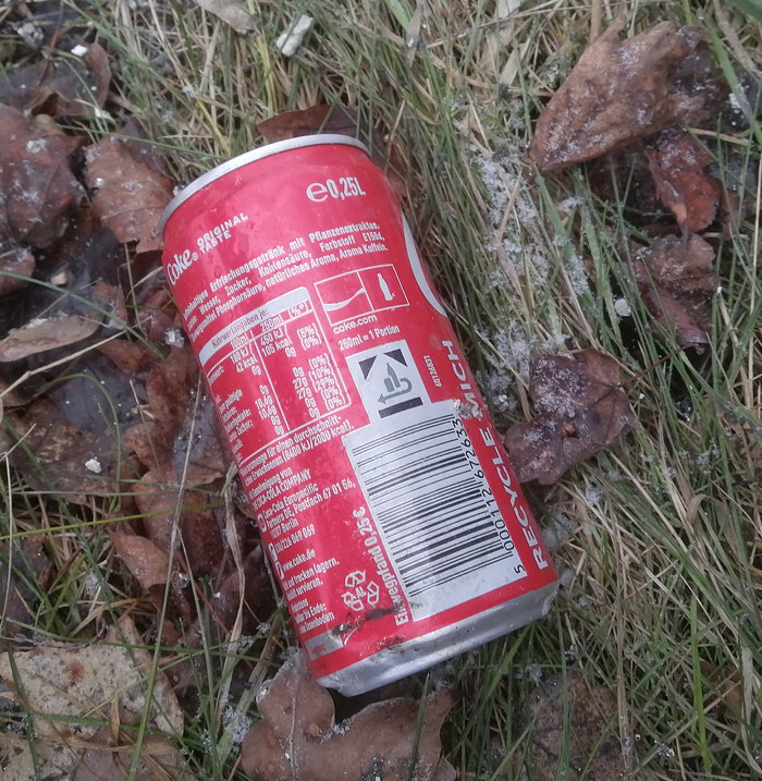 Wenn ich aus welchen Gründen auch immer keine Runde mit dem Rad fahre, dann gehe ich eben eine größere Strecke. Dabei komme ich immer, wie ja bereits des Öfteren bemerkt, irgendwie bei der Autobahn vorbei. Und da wiederum fällt mir auf, dass viele Autofahrer ihr Auto ganz gerne sauber halten möchten, bevor sie die Stadtgrenze überfahren. Was heißt, sie werfen überschüssigen Ballast einfach aus dem Fenster. Und weil es jetzt ja das Flaschenpfand gibt, und dort niemand entlang geht, um die Bier- und Coladosen aufzusammeln, mache ich dann das eben manchmal. Ich denke, ich werde dort auch irgendwann mit einem größeren Sack entlanggehen, um den ganzen anderen Müll einmal aufzusammeln, aber erst, wenn es wieder etwas wärmer wird. Heute fand ich dabei eine Dose mit einem Recycling-Symbol, das bei uns wahrscheinlich eher nicht von den Automaten angenommen wird.