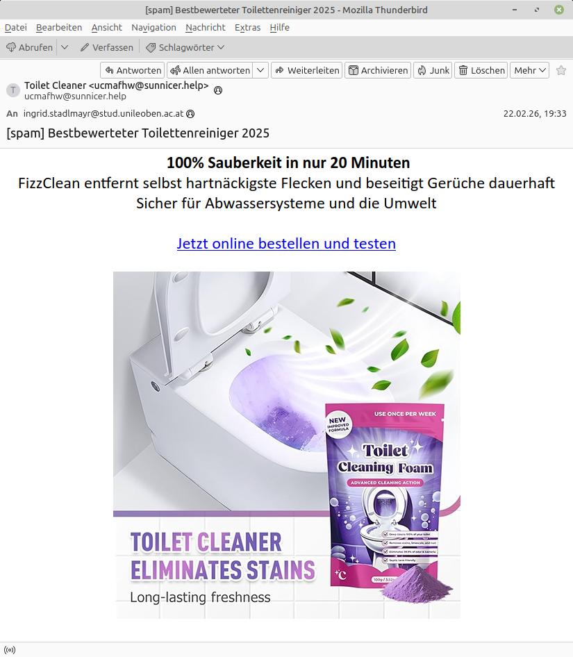 wo Kloreiniger beworben wird. Angeblich war das der beste Kloreiniger im Jahr 2025. Naja, wenn eine Firma SPAM benötigt, um ein Produkt zu bewerben, dann kann es um die Qualität nicht wirklich gut bestellt sein, oder so ähnlich...